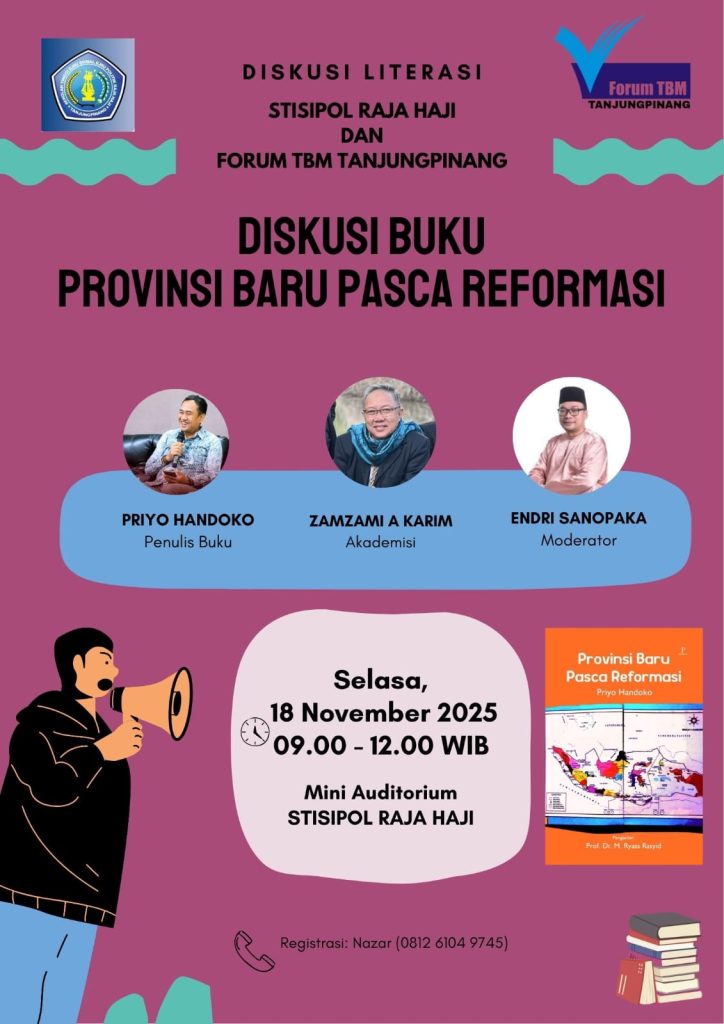 Bintan, Rabu 19 November 2025 – STISIPOL Raja Haji bekerja sama dengan Forum TBM Tanjungpinang kembali menghidupkan ruang dialog publik melalui Diskusi Literasi bertema “Provinsi Baru Pasca Reformasi”. Kegiatan yang berlangsung di Mini Auditorium STISIPOL Raja Haji ini menghadirkan penulis buku Provinsi Baru Pasca Reformasi Priyo Handoko, akademisi Zamzami A. Karim, dan Endri Sanopaka sebagai moderator.